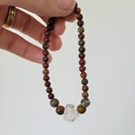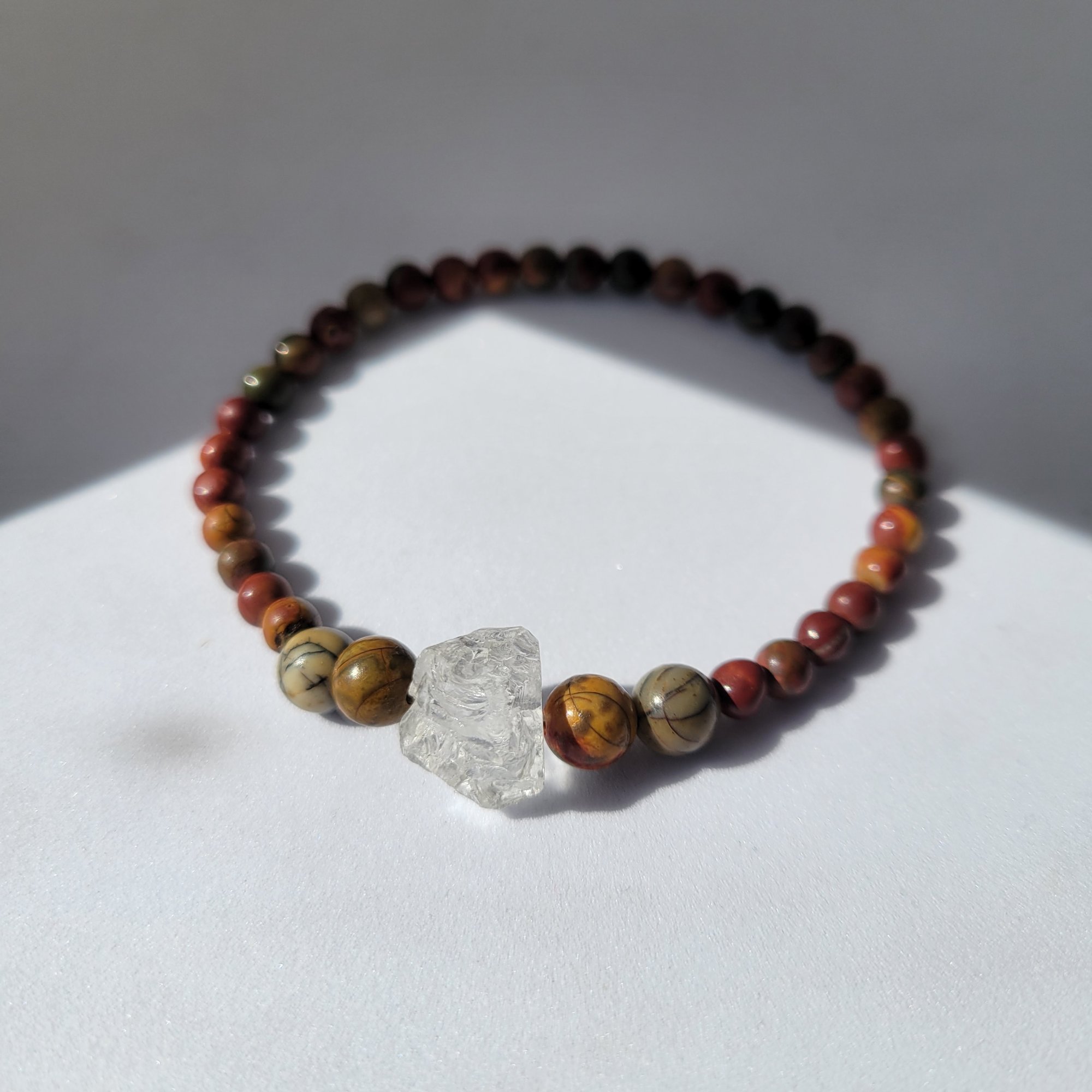 Stretchy bracelet with Picasso jasper flanking a centre clear quartz gemstone.